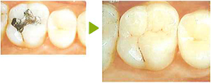 インレー(詰め物)には従来アマルガムや金属が使用されてきましたが、黒く目立ち見た目にはあまりよくありませんでした。セラミックを使用することにより、治療箇所が目立たず、非常に健康的に見えます。