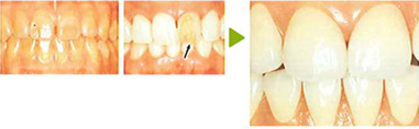 歯の色がくすんでいたり、ケガなどで歯の一部が欠けたりなどの悩みには、セラミックの薄片を張り合わせる治療を行うことで解決します。天然歯の形、健康的な色艶に再現します。